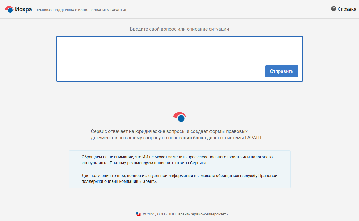Компания «Гарант» проводит открытое бета-тестирование нового сервиса «Искра» на базе технологии ГАРАНТ-AI (AI – искусственный интеллект, англ.). Этот продукт впервые на рынке российских справочных систем позволяет готовить ответы на правовые вопросы и создавать шаблоны документов с помощью искусственного интеллекта. Нейросеть использует последние разработки в области генеративного ИИ и информационный банк системы ГАРАНТ.